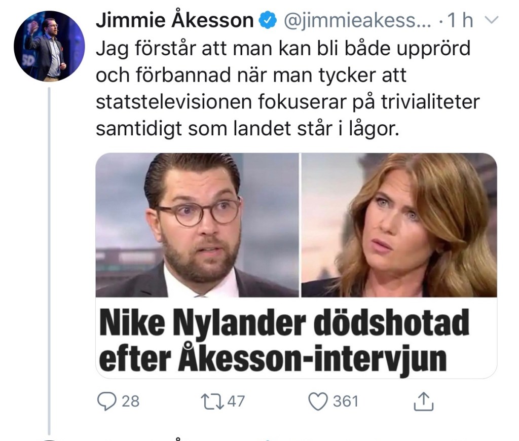 Åkesson älskar förstås det. Plötsligt likställs kriminalitet med invandring. Landet står i brand ropar han på twitter i ett bisarrt och Trumpartat inlägg.