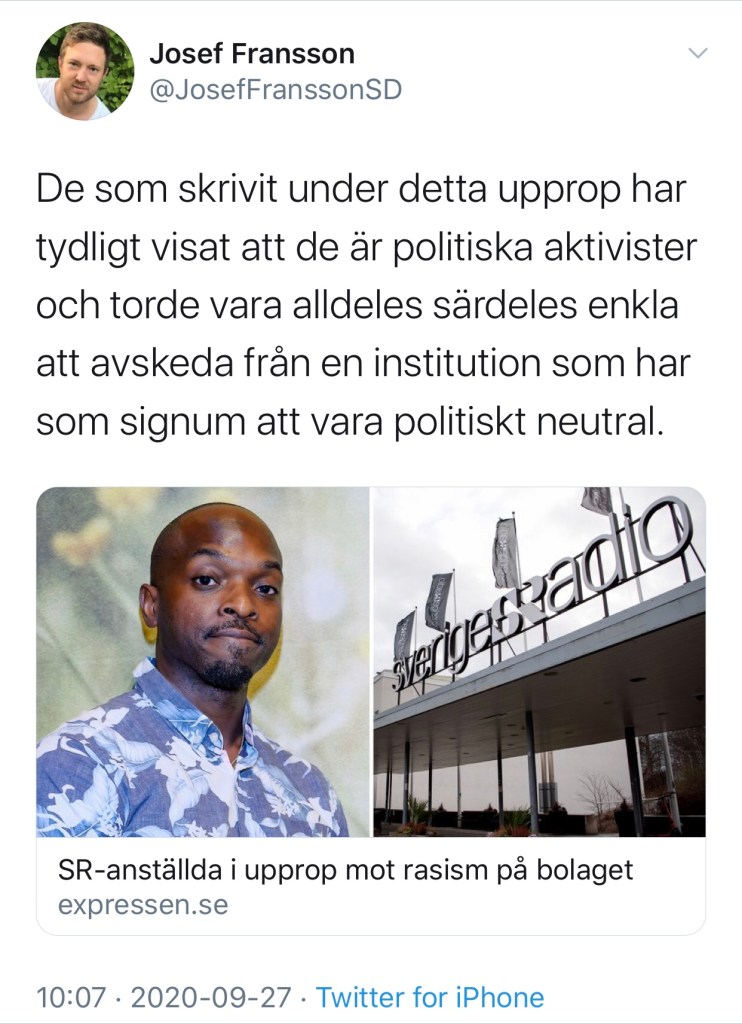 De torde vara ”enkla att avskeda” utropade SD-riksdagsledamoten Josef Fransson om de medarbetare vid Sveriges Radio som skrivit på ett upprop mot rasism och diskriminering på sin arbetsplats. Enligt Fransson gjorde detta dem till ”politiska aktivister” som bröt mot Sveriges Radios uppdrag att vara ”politiskt neutral”. Sverigedemokraterna retweetade hans angrepp på sitt officiella konto.