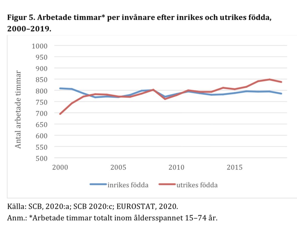 Arbetslösheten är högre bland utrikes än inrikes födda, och skulle man kunna sänka den och åstadkomma ett snabbare arbetsmarknadsinträde vore mycket vunnet. Det är alla överens om. Men vad som inte är lika känt är det trendbrott som ägde rum i början av 2010-talet. Sedan dess arbetar i genomsnitt utländskt födda fler antal timmar per individ än inrikes födda och det är sannolikt att denna utveckling fortsätter under det kommande decenniet. Det här beror på att utrikes födda har lägre medelålder. Vad betyder det här? Enkelt uttryckt att utan invandringen skulle den inhemska befolkningen behöva arbeta längre upp i åren eller fler timmar varje år för att finansiera välfärden.