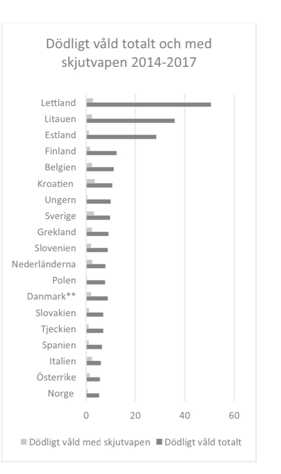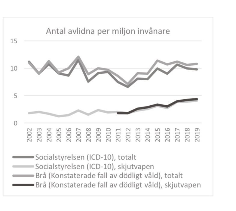 För det första att det totala dödliga våldet inte har ökat i Sverige jämfört med hur det var under de första åren av det nya millenniet. I början av millenniet avled 10-11 personer till följd av dödligt våld. Det gjorde det under 2019 också. Även om det inte ingår i jämförelsen med övriga länder, framgår det av rapporten att under 2020 ökade det dödliga våldet ytterligare till 12 per miljon. Det är högre än under början av millenniet, men lägre än i början av 90-talet, då det dödliga våldet låg på 14-15 per miljon invånare.